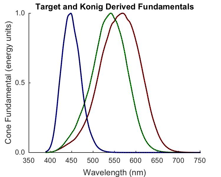 if (runTimeParams.generatePlots) [stockmanSharpe10Fig,figParams] = cbFigInit; figParams.xLimLow = 350; figParams.xLimHigh = 750; figParams.xTicks = [350 400 450 500 550 600 650 700 750]; figParams.xTickLabels = {'^{ }350_{ }' '^{ }400_{ }' '^{ }450_{ }' '^{ }500_{ }' ... '^{ }550_{ }' '^{ }600_{ }' '^{ }650_{ }' '^{ }700_{ }' '^{ }750_{ }'}; figParams.yLimLow = 0; figParams.yLimHigh = 1; figParams.yTicks = [0 0.5 1]; figParams.yTickLabels = {' 0.0 ' ' 0.5 ' ' 1.0 '}; % Plot the fundamentals. plot(data.wls_1nm,data.T_cones10_1nm(1,:)','r','LineWidth',figParams.lineWidth); plot(data.wls_1nm,data.T_cones10_1nm(2,:)','g','LineWidth',figParams.lineWidth); plot(data.wls_1nm,data.T_cones10_1nm(3,:)','b','LineWidth',figParams.lineWidth); % Pop on top the fit derived from the simulated confusion lines. plot(data.wls_1nm,data.T_cones10_1nm_copunctalDerived(1,:)','k:','LineWidth',figParams.lineWidth-1); plot(data.wls_1nm,data.T_cones10_1nm_copunctalDerived(2,:)','k:','LineWidth',figParams.lineWidth-1); plot(data.wls_1nm,data.T_cones10_1nm_copunctalDerived(3,:)','k:','LineWidth',figParams.lineWidth-1); xlabel('Wavelength (nm)','FontSize',figParams.labelFontSize); ylabel('Cone Fundamental (energy units)','FontSize',figParams.labelFontSize); title('Target and Konig Derived Fundamentals','FontSize',figParams.titleFontSize); cbFigAxisSet(stockmanSharpe10Fig,figParams); % Save the figure FigureSave(fullfile(outputDir,[mfilename '_KonigDerivedConeFundamentals']),stockmanSharpe10Fig,figParams.figType); end